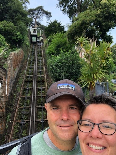 Woolacombe was in now in a patchy mist as I walked along the green lawns above the section known as the barricane. It was no surprise to hear “coooooeeeeee” from above as Niky appeared with another million dollar hug. We had our first ever photo as a ‘we are now going out’ couple in 1998 on those greens and 23 years later we had a go at replicating the photo with the help of a kind tourist.